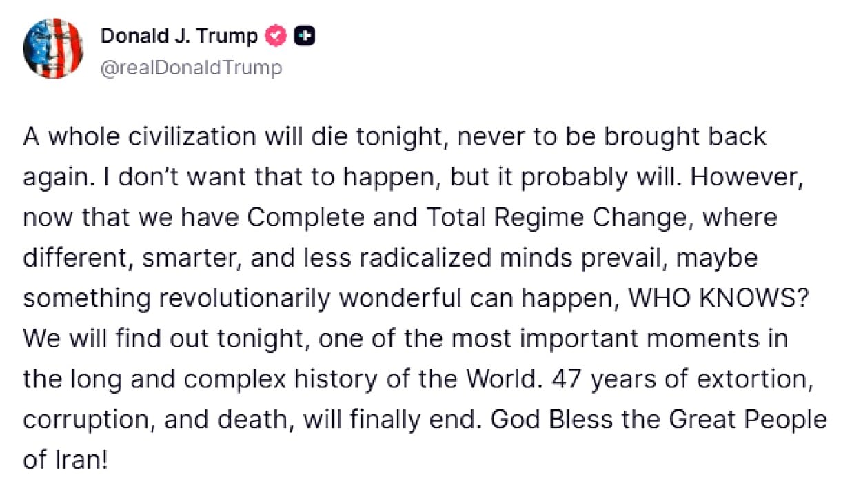President Donald Trump warns of civilization-ending strike on Iran amid escalating crisis -